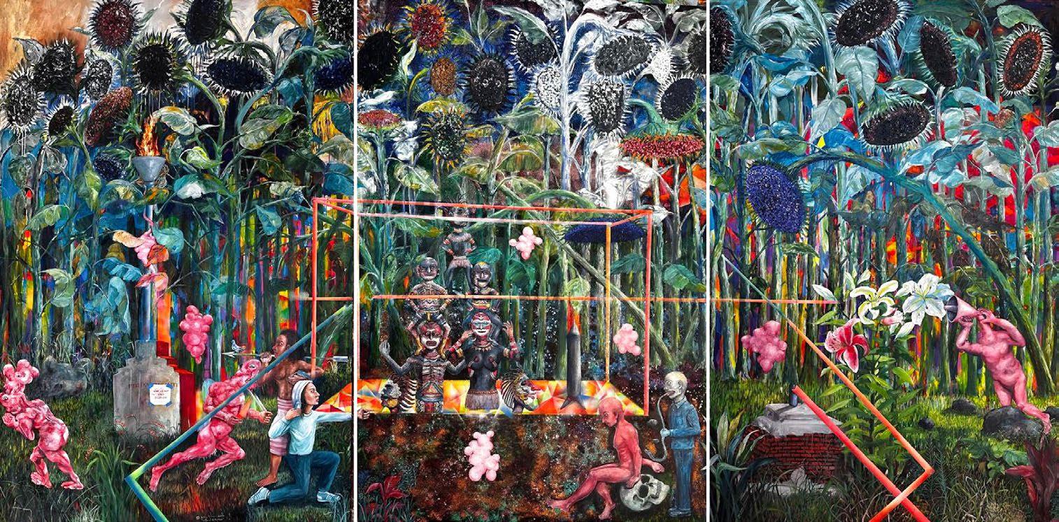 Acrylic, graphite and oil on canvas with collaged eyes of resin, color pigment and thread