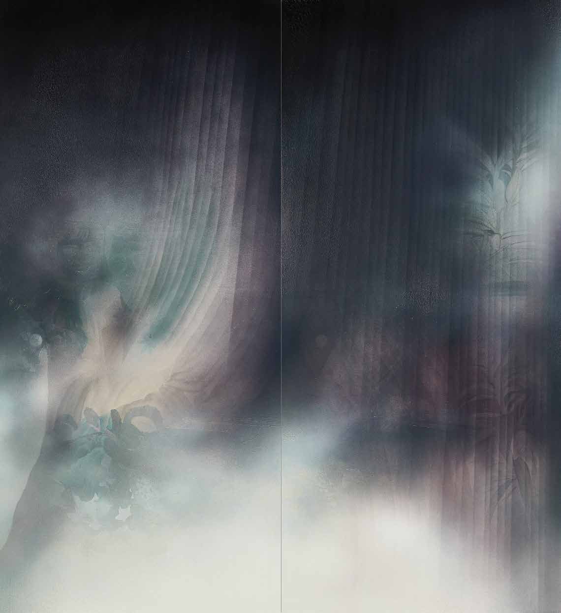 Oil paint, acrylic paint, image transfer, lacquer paint and polyurethane clear coat on bended aluminium sheet