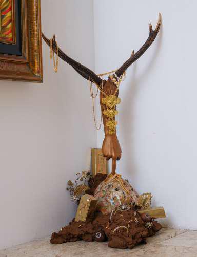 bullhorns, goat leather, metal, etching brass, teak and motion sensor