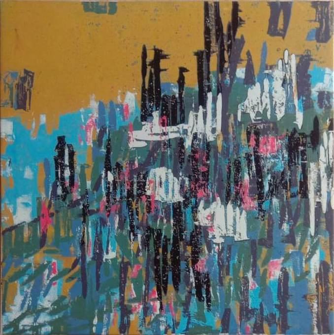 Woodcut print diatas kain, aluminium lukisan tinta cina dan akrilik diatas kertas