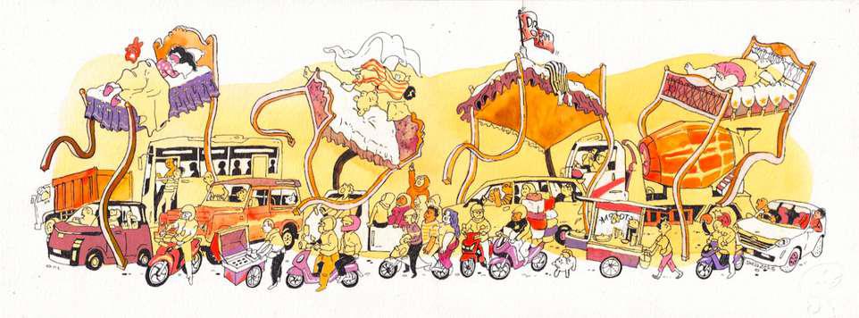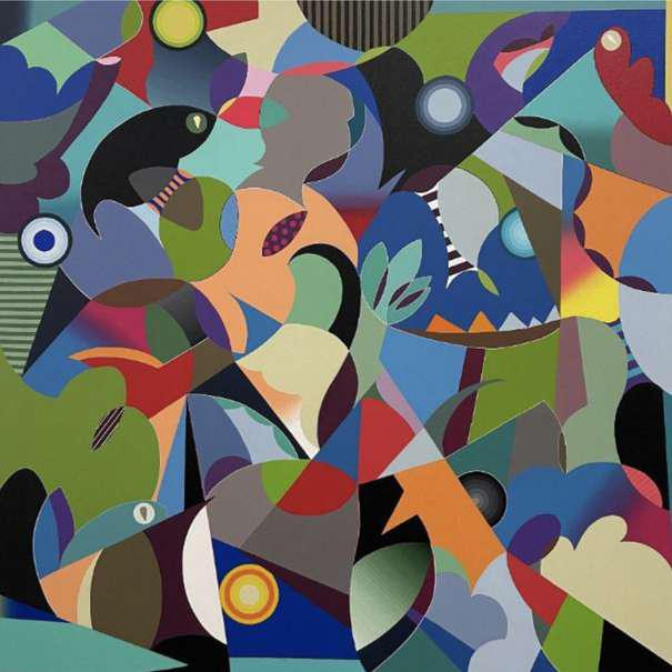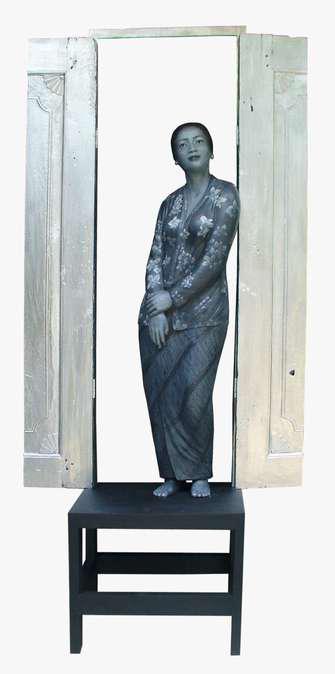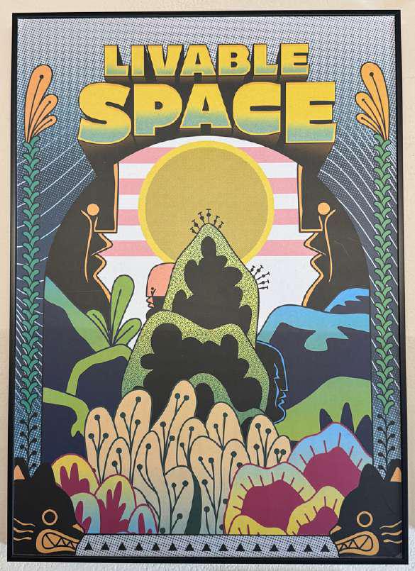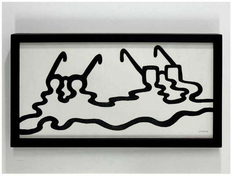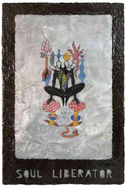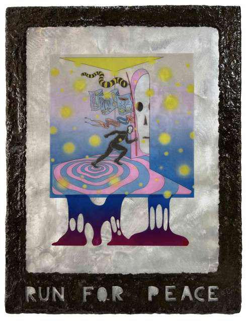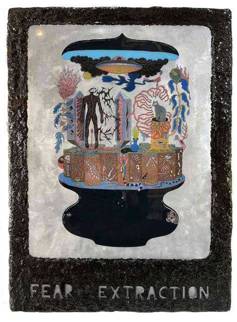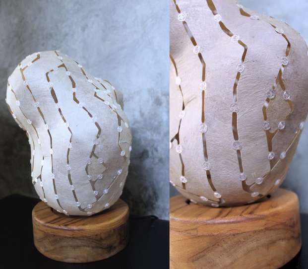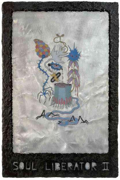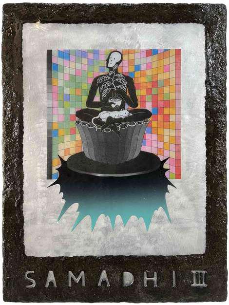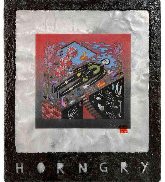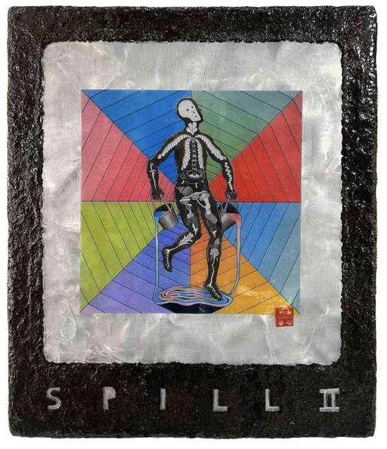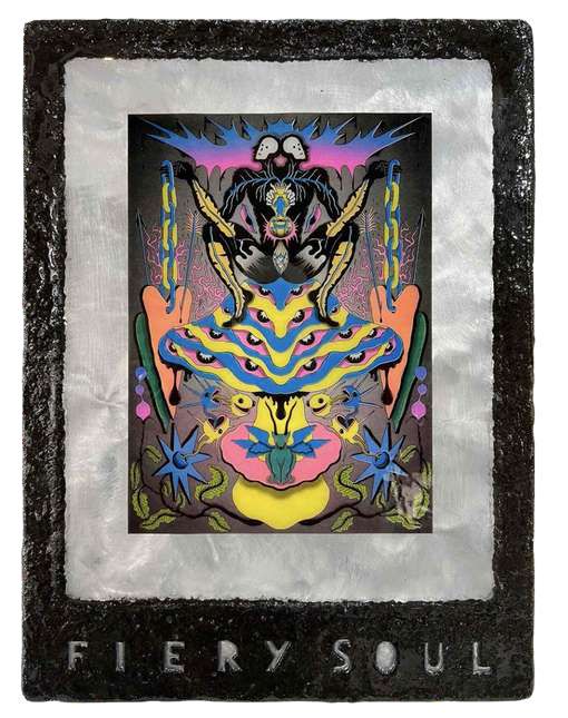 Hand-cut Riso print on paper, mounted on alumunium plate on plywood framed with recycled card board papier machè, sealed with anti UV resin
