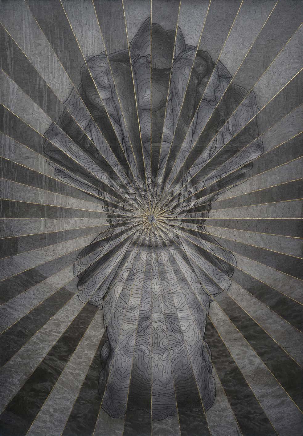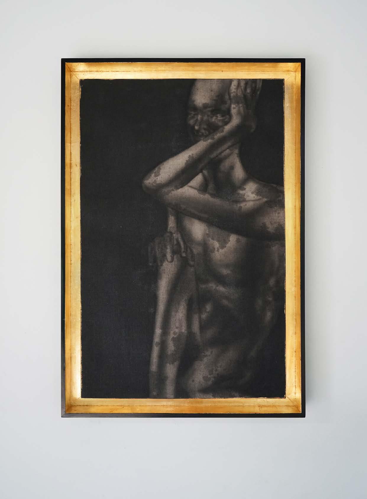 Acrylic ink, musou black ink, iridescent and gold leaf on linen with wood frame