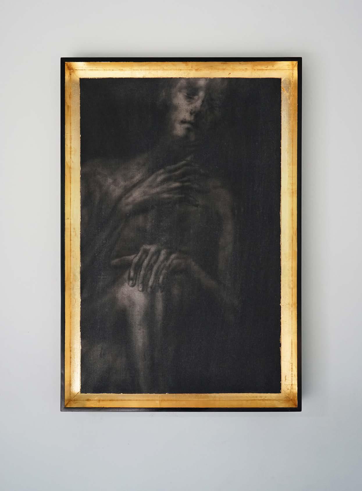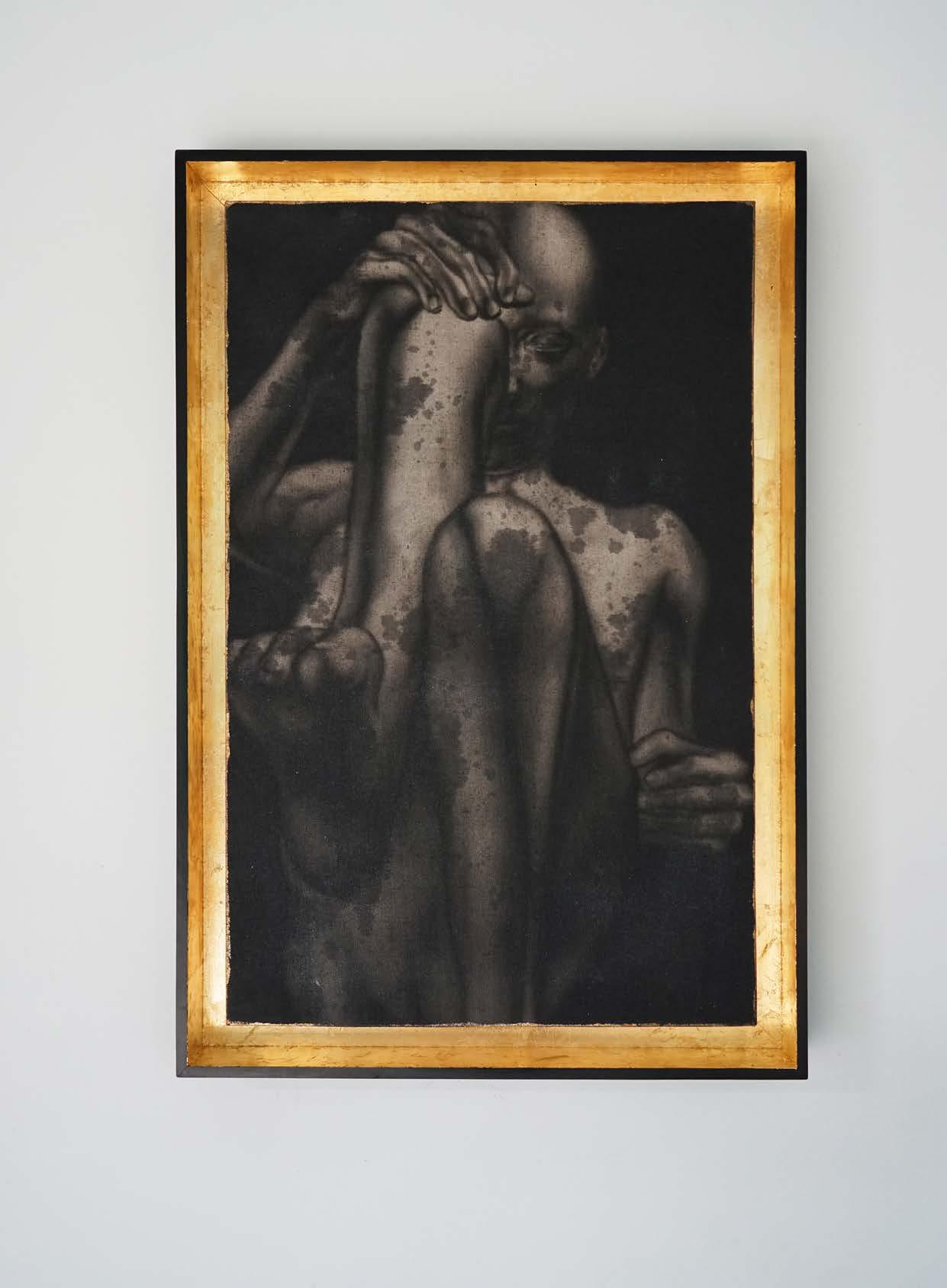 Acrylic ink, musou black ink, iridescent, and gold leaf on linen with wood frame and mirror