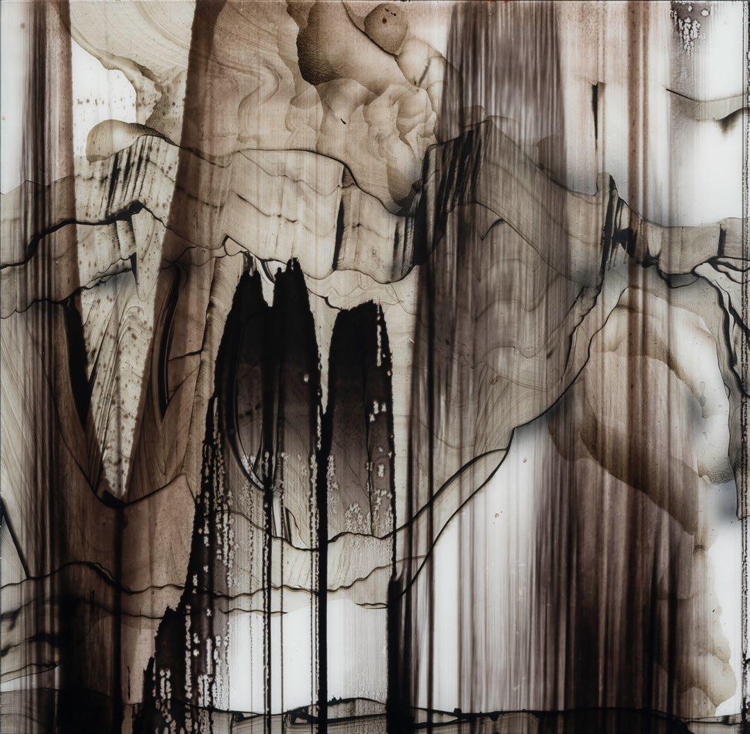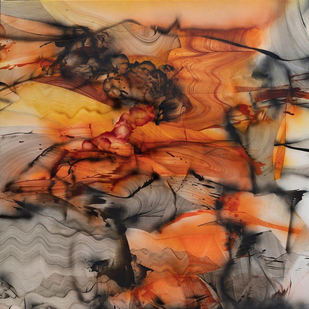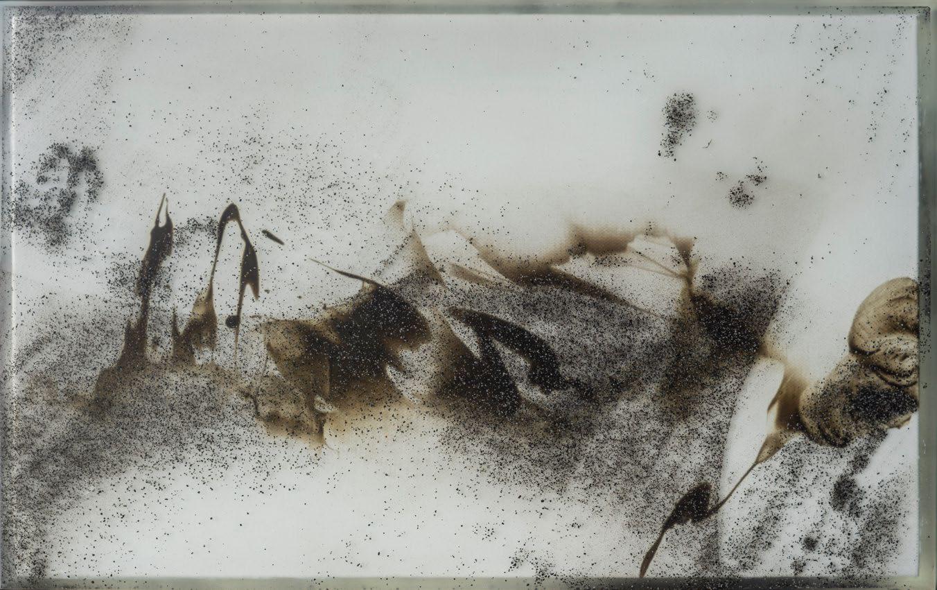 Merapi volcanic ash, palm oil charcoal, coal, pigmented resin and canvas on wooden panel