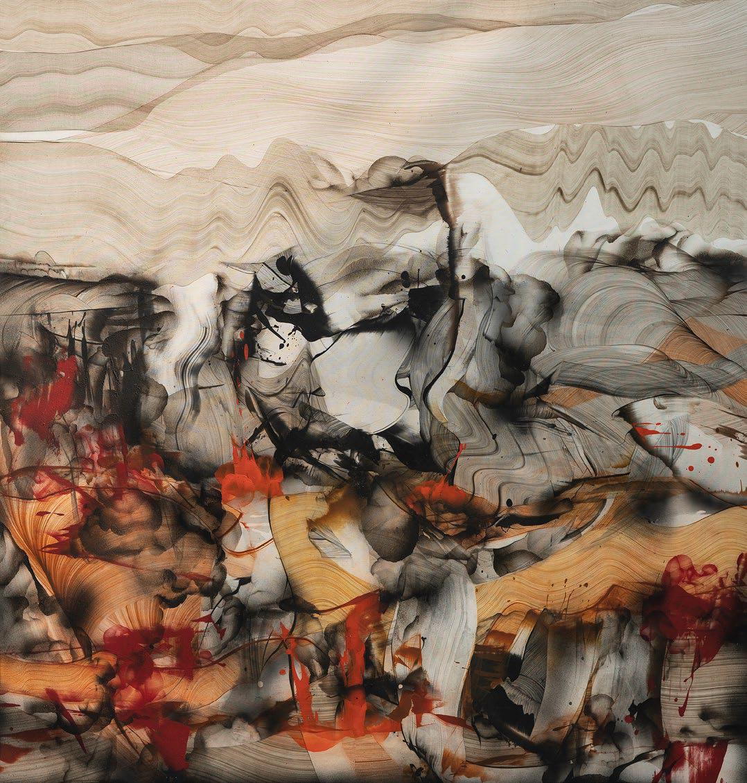 Merapi volcanic ash, palm oil charcoal, coal, resin and canvas on wooden panel