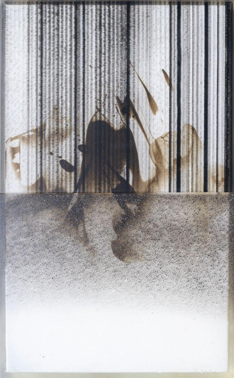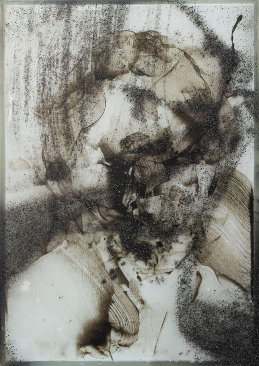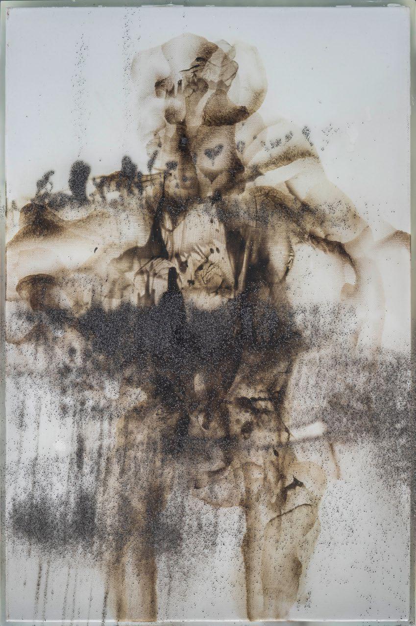 Palm oil charcoal, fiber, resin and digital print on wooden panel