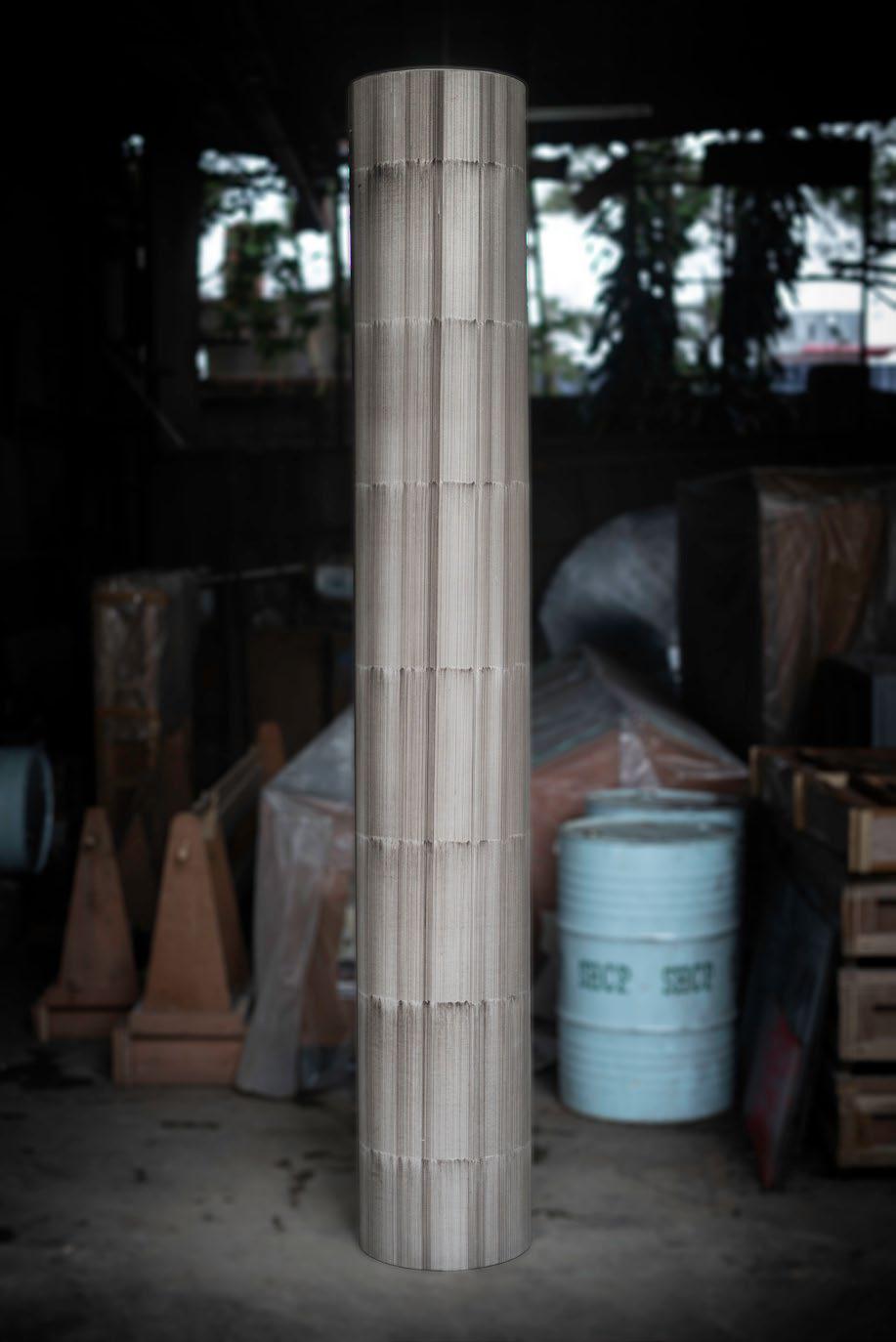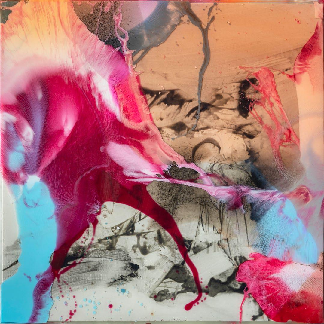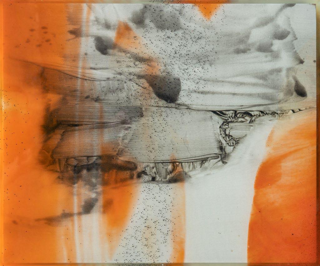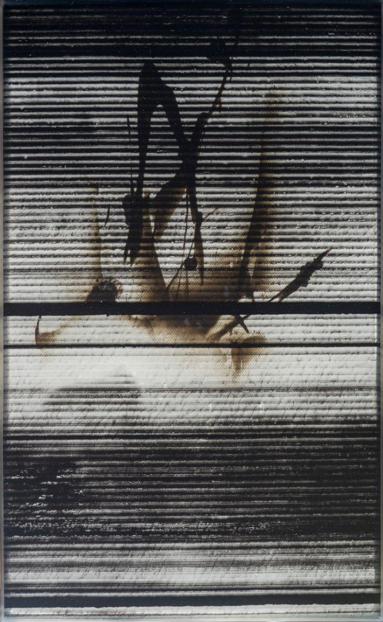 Palm oil charcoal, fiber, resin and digital print on wooden panel