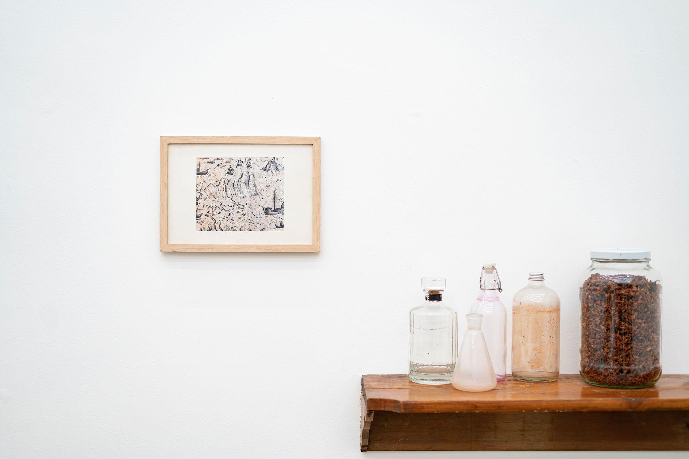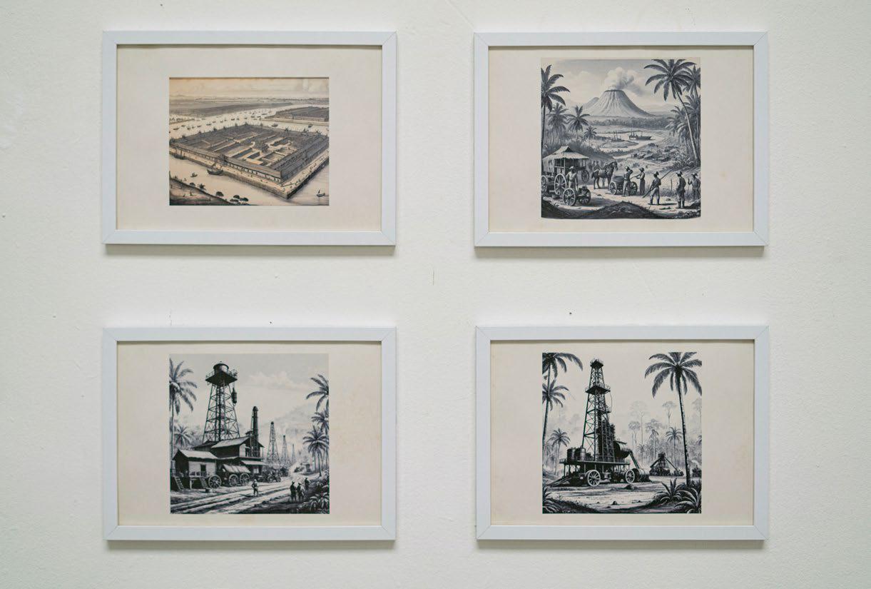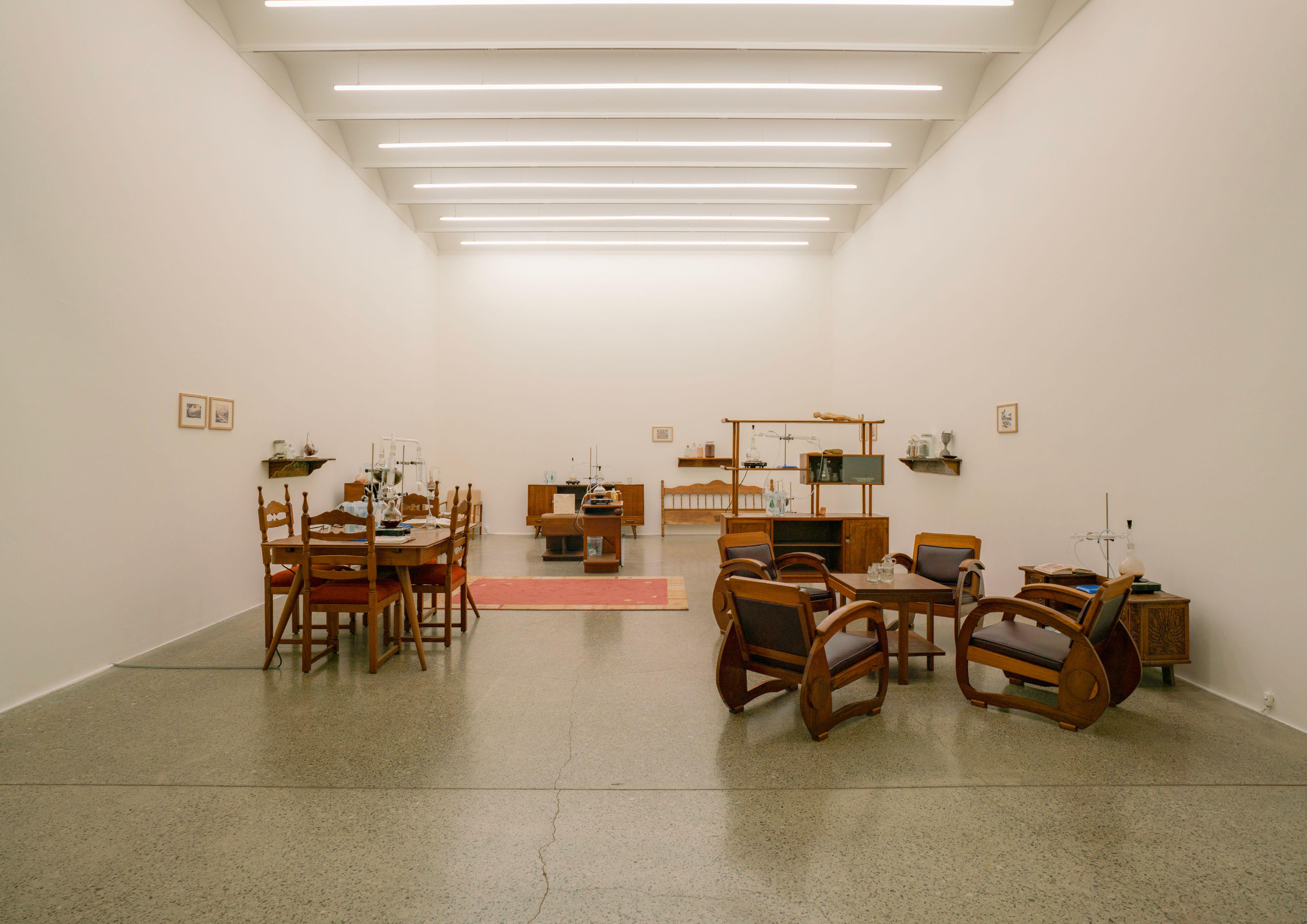 Various furniture, glass distillation, glass condenser, electrical stoves, books, limestone, nutmeg, palm sugar, cloves, pandan, jasmine, tapak liman, pepper, cinnamon, sandalwood, sea water, spices display
