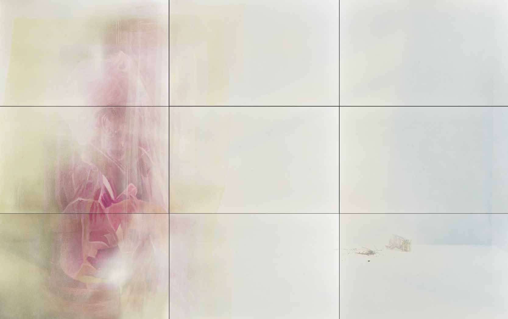 Oil paint, acrylic paint, image transfer, lacquer paint and polyurethane clear coat on bended aluminium sheet