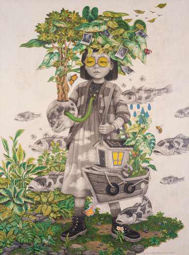 Arang, grafit, akrilik di atas kanvas