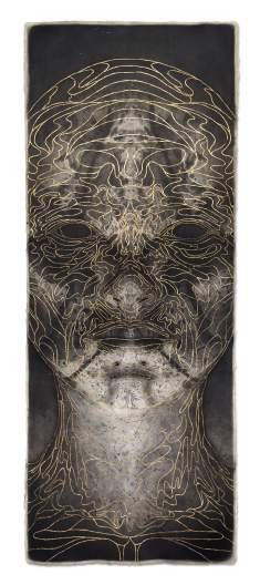 Acrylic ink, musou black, iridescent, and gold leaf on linen
