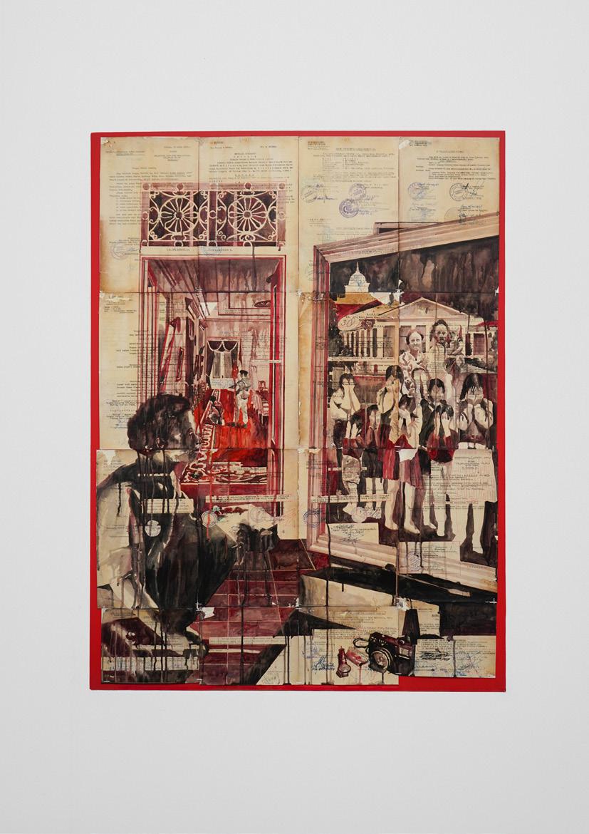 water-based oil paint on 16 sheets of found documents