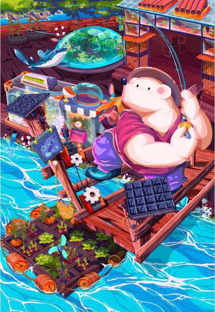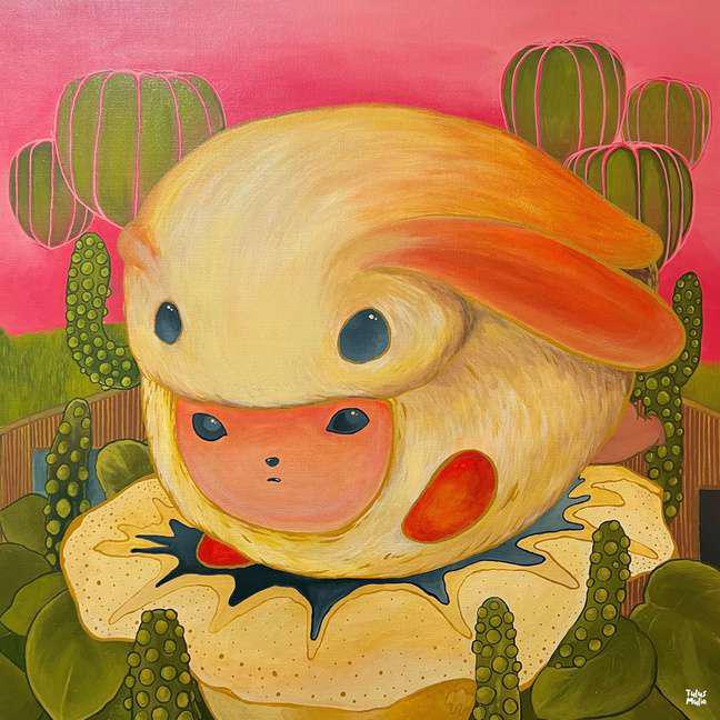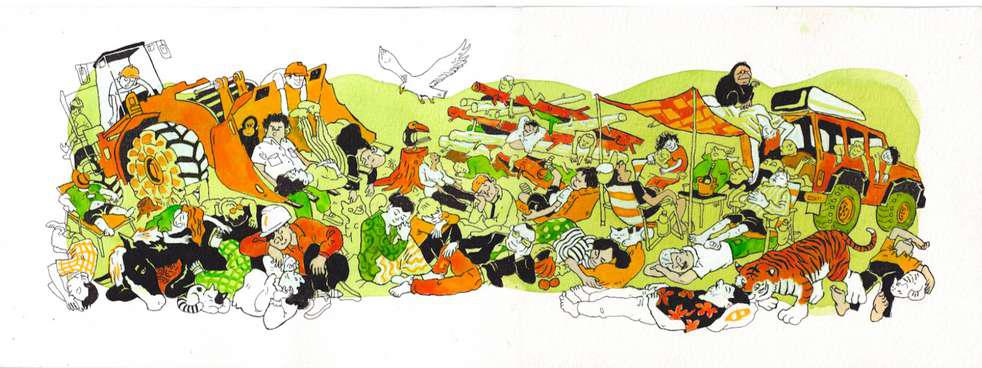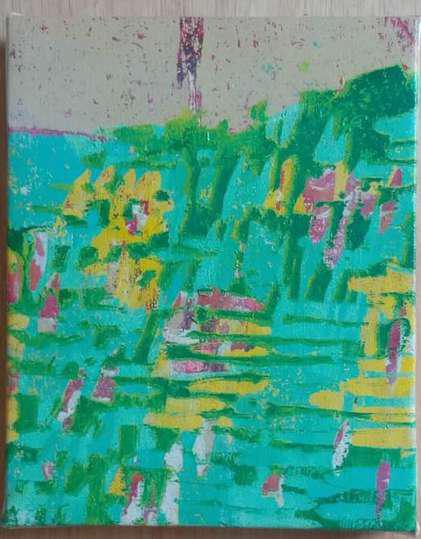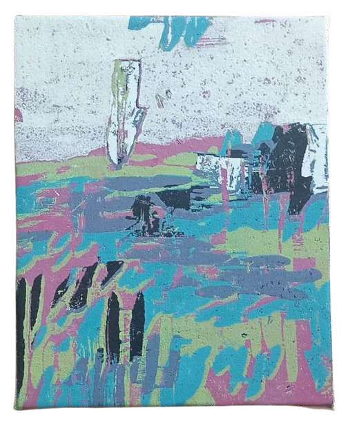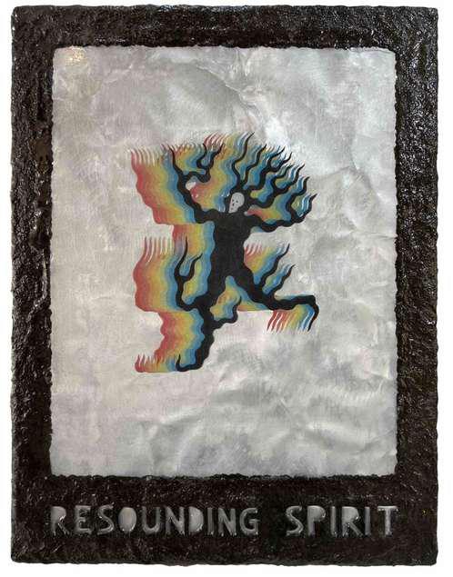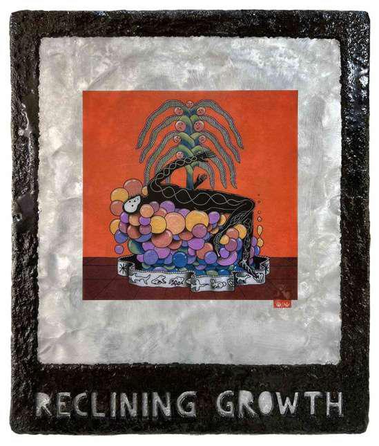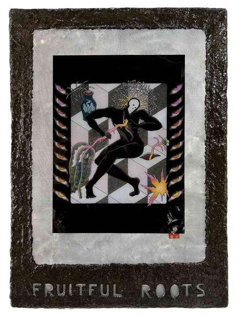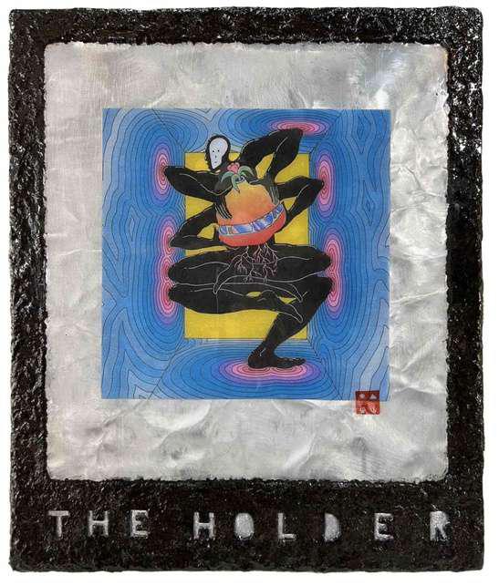 Hand-cut Riso print on paper, mounted on alumunium plate on plywood framed with recycled card board papier machè, sealed with anti UV resin