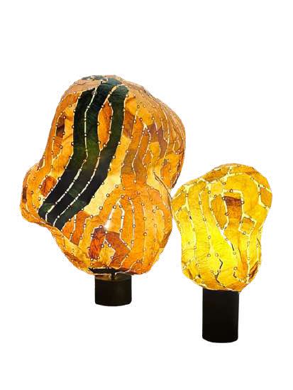 Bronze casting, copper, electro gold plating, electro silver plating, leather rope, polyurethane painted