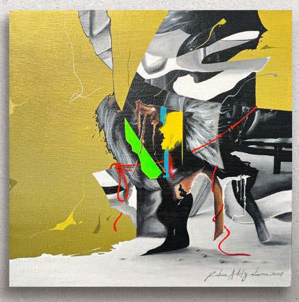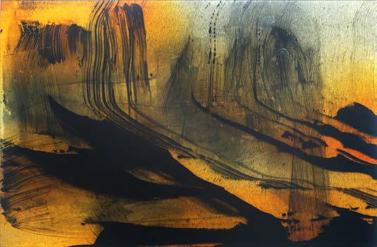 acrylic, charcoal, ash from Krack’s fire, gold leave on aluminum composite panel