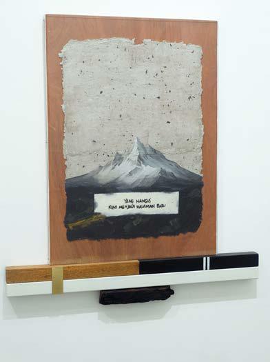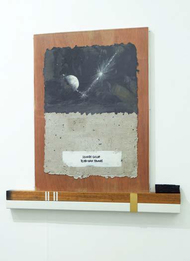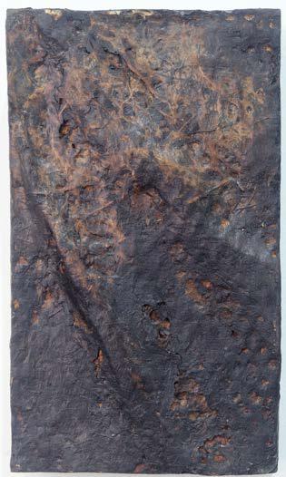 acrylic on recycled gray paper made from the remnants of the Krack Studio fire, with acrylic frame, wood, brass plate, hollow steel, and burnt window wood from the site