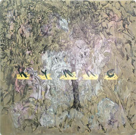 acrylic, charcoal, ash from Krack’s fire, gold leave on aluminum composite panel
